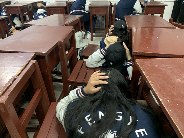 学生躲避桌下