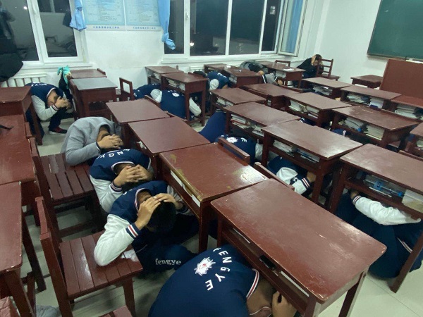 下午20:00整,教学楼准时发出地震信号,全校师生按照系办防震演练预案要求,沉着冷静,井然有序的利用课桌有效地进行自护,在老师和纪检部的指挥下双手抱头,先从教学楼五楼依次往下撤离,快速有序的跑向操场集合。在整个演练过程中,效果良好确保学生安全撤离。