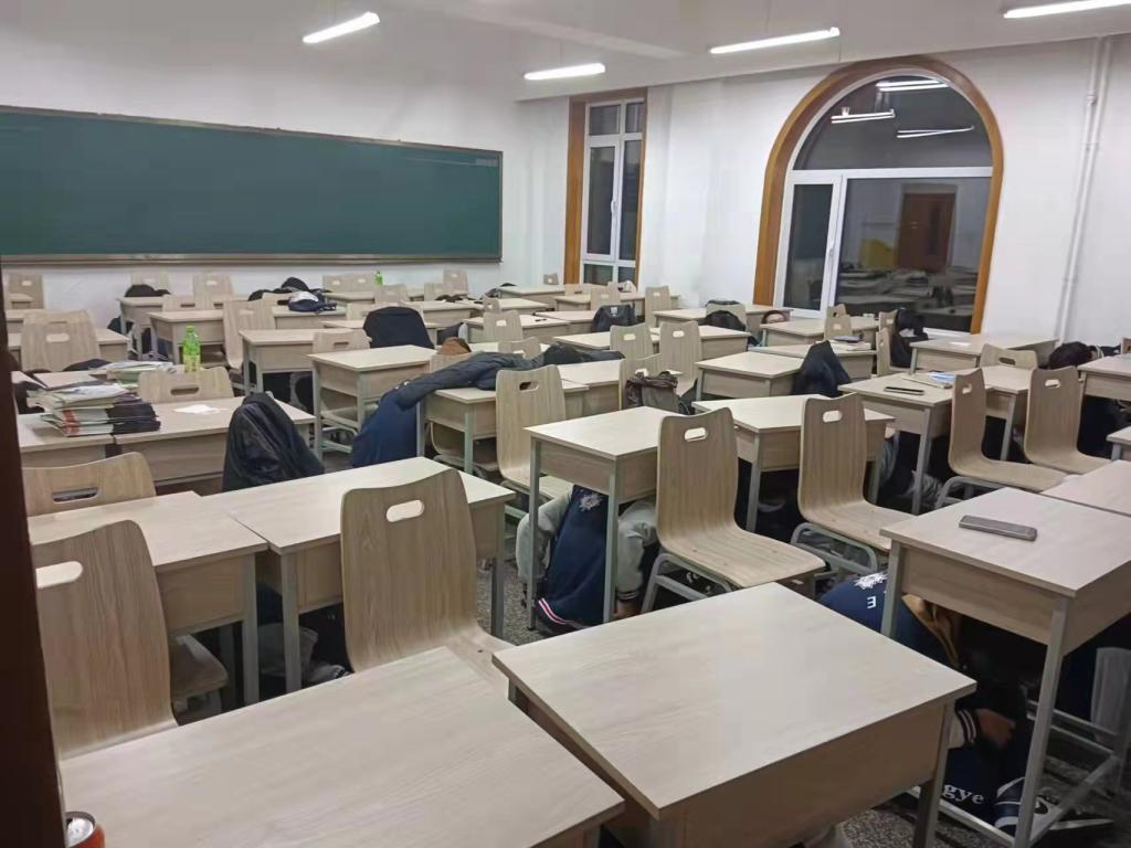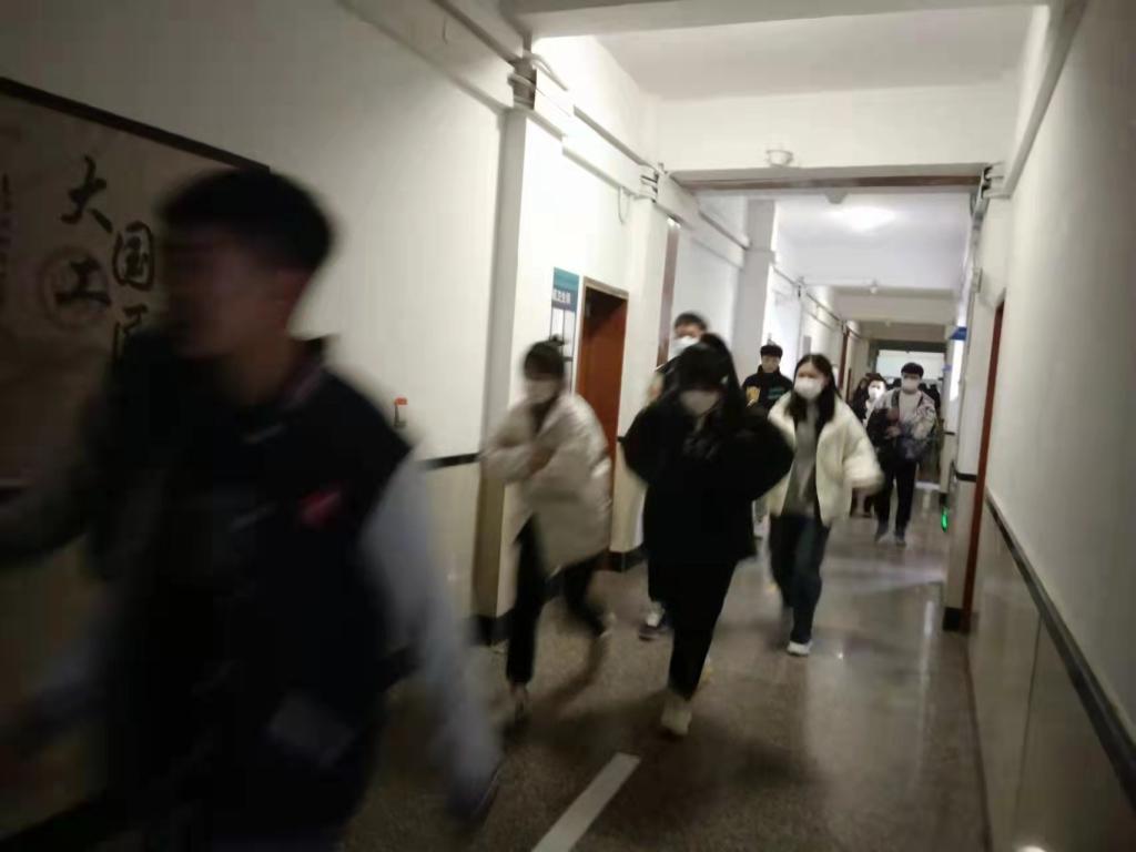 19:00,警报哨声响起,防震演练正式开始。“地震来了!地震来了!“各班负责人紧急应对、相互配合,快速指引学生躲在桌底、墙角等安全区域避险。