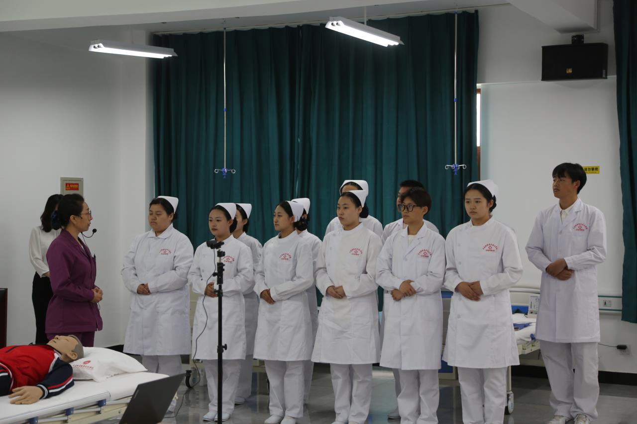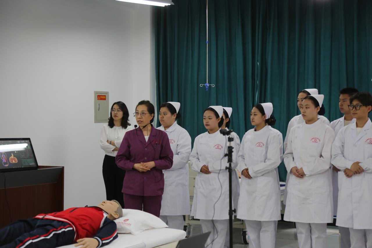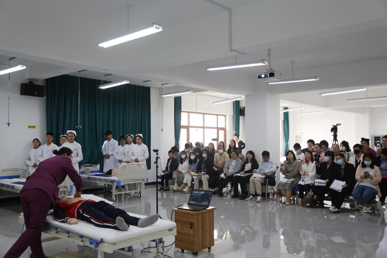 在观摩课环节,由市就业人才中心职建部魏春旭老师主持,学校护理专业教师代英波、马贺现场讲授《基础护理学》课程——心肺复苏。
