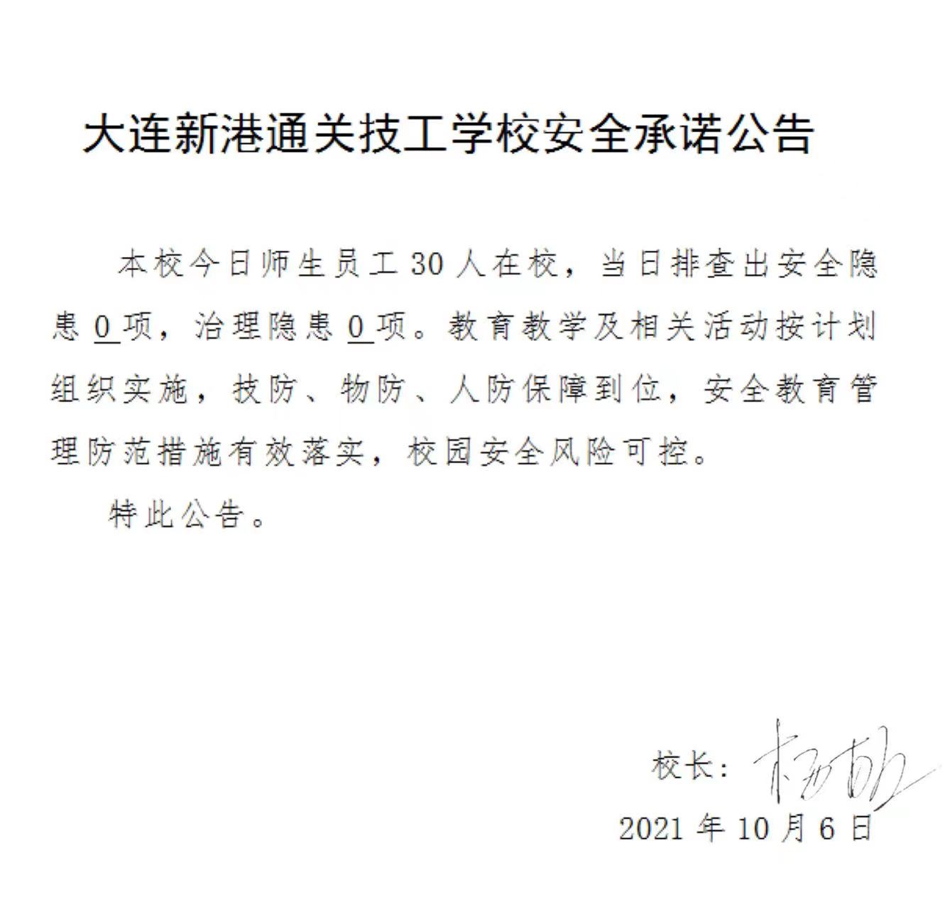 大连新港通关技工学校安全承诺公告(10月6日)