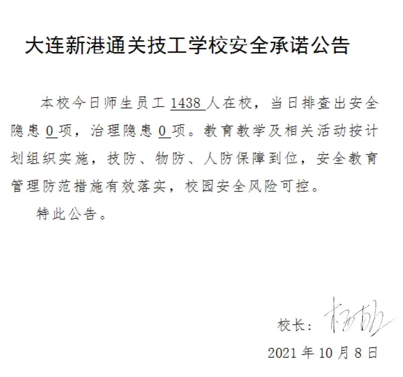 大连新港通关技工学校安全承诺公告(10月8日)
