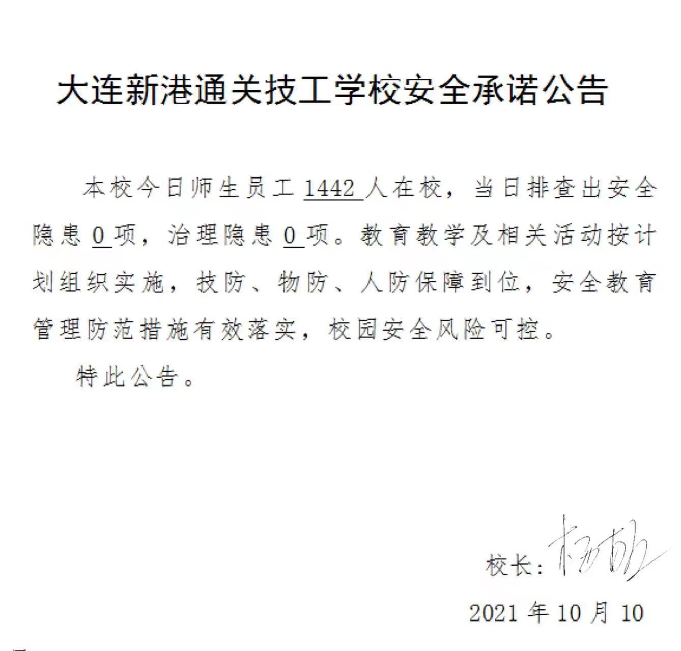 大连新港通关技工学校安全承诺公告(10月10日)