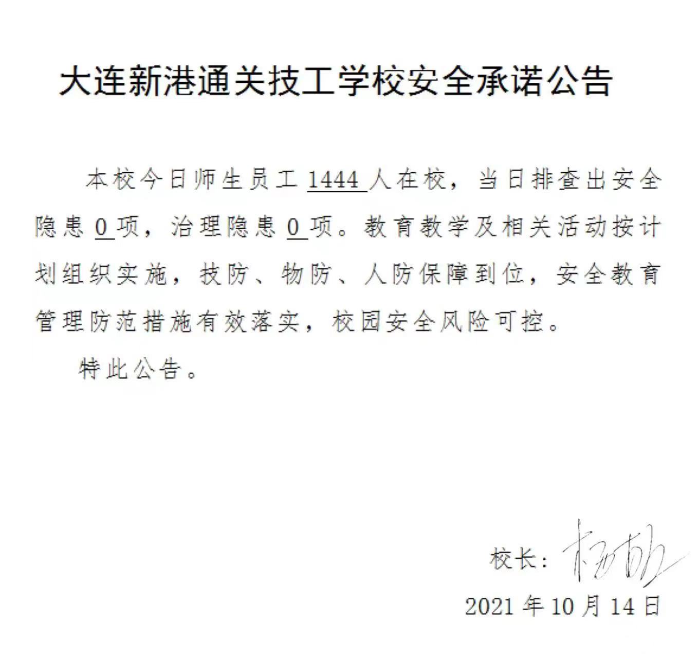 大连新港通关技工学校安全承诺公告(10月14日)