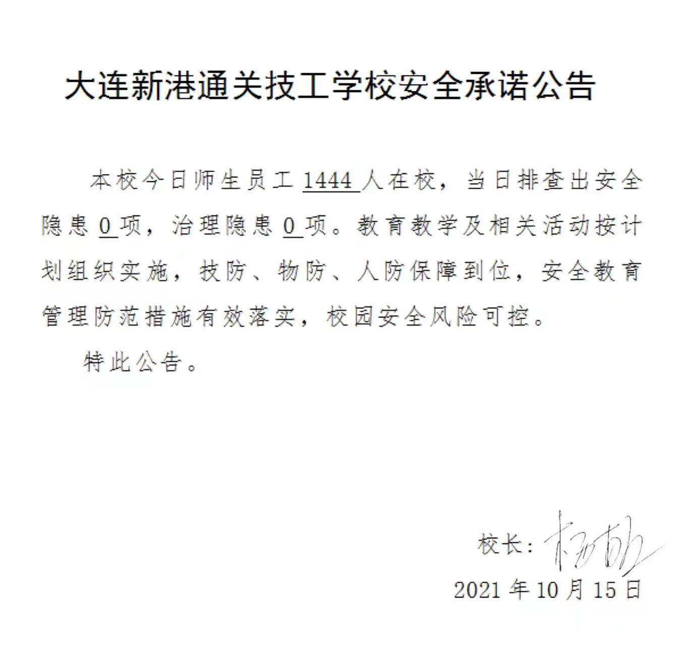 大连新港通关技工学校安全承诺公告(10月15日)