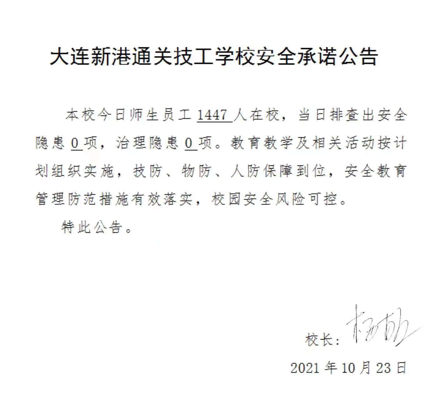 大连新港通关技工学校安全承诺公告(10月23日)