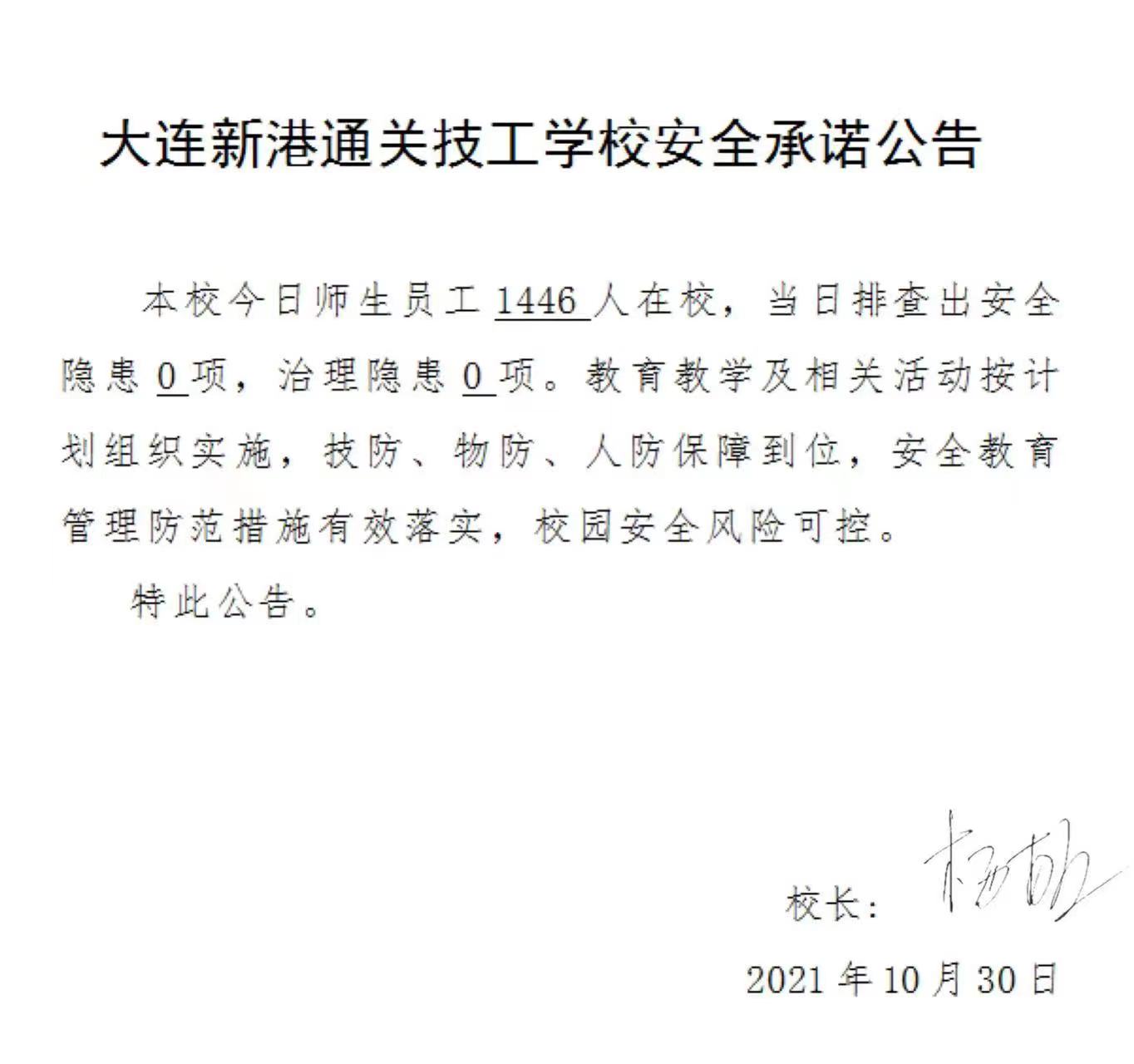 大连新港通关技工学校安全承诺公告(10月30日)