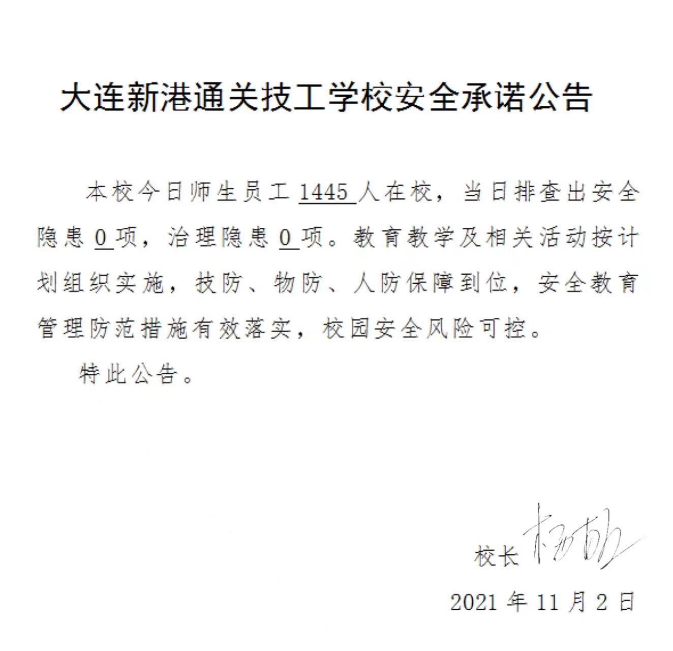 大连新港通关技工学校安全承诺公告(11月2日)