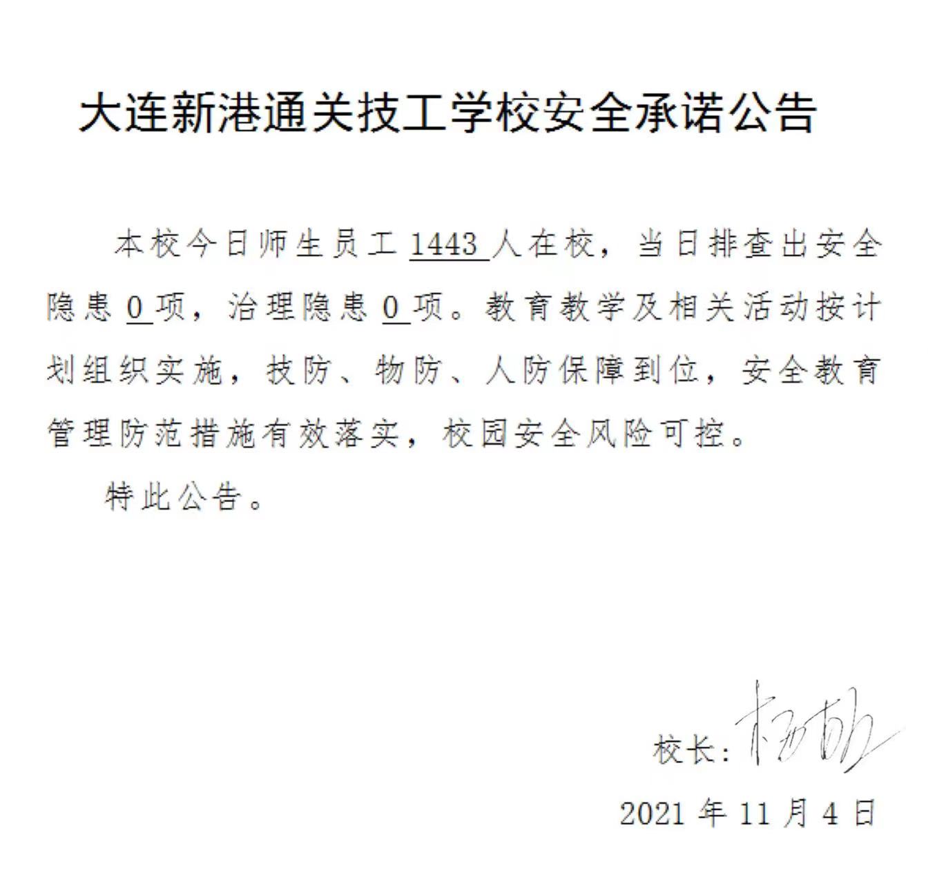 大连新港通关技工学校安全承诺公告(11月4日)