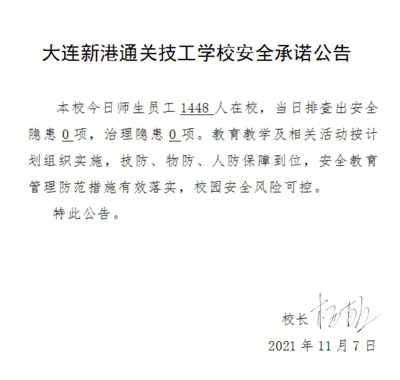 大连新港通关技工学校安全承诺公告(11月7日)