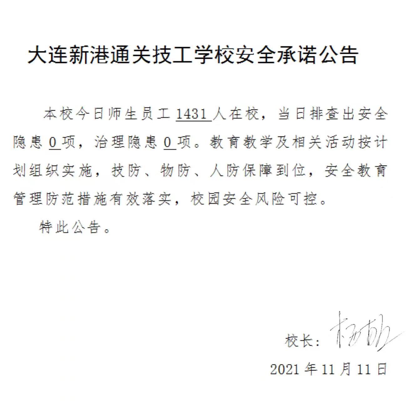 大连新港通关技工学校安全承诺公告(11月11日)