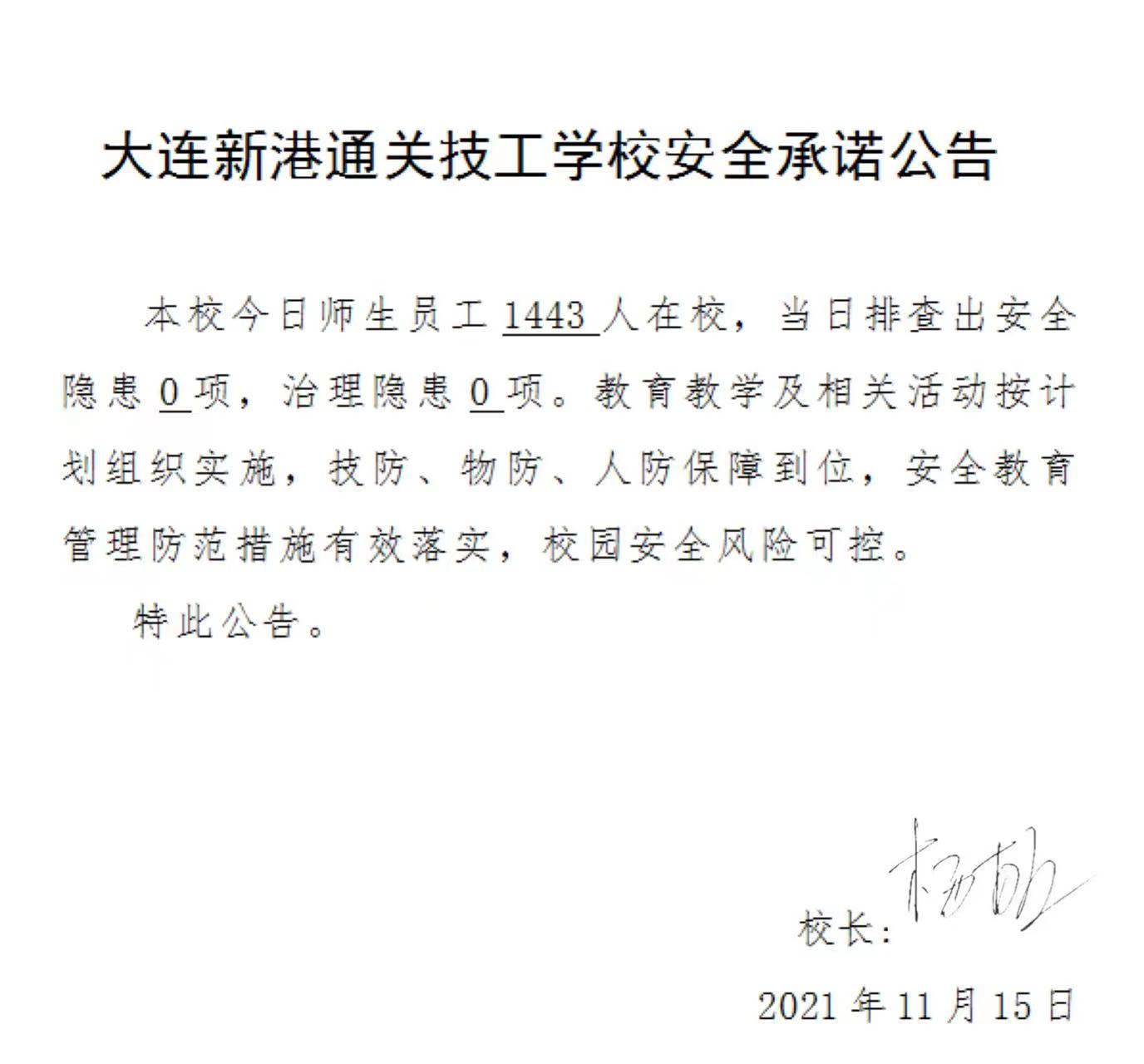 大连新港通关技工学校安全承诺公告(11月15日)