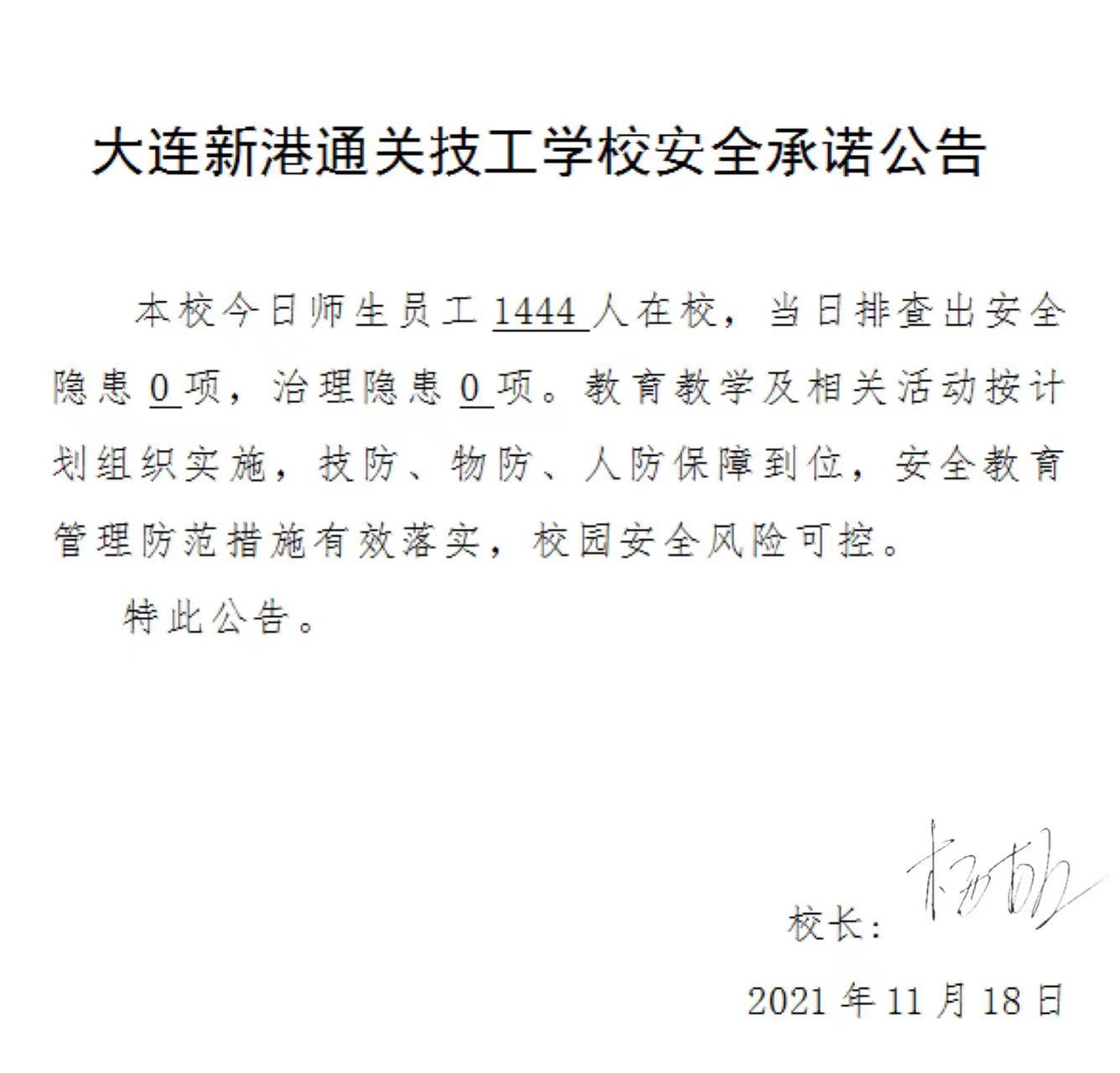 大连新港通关技工学校安全承诺公告(11月18日)