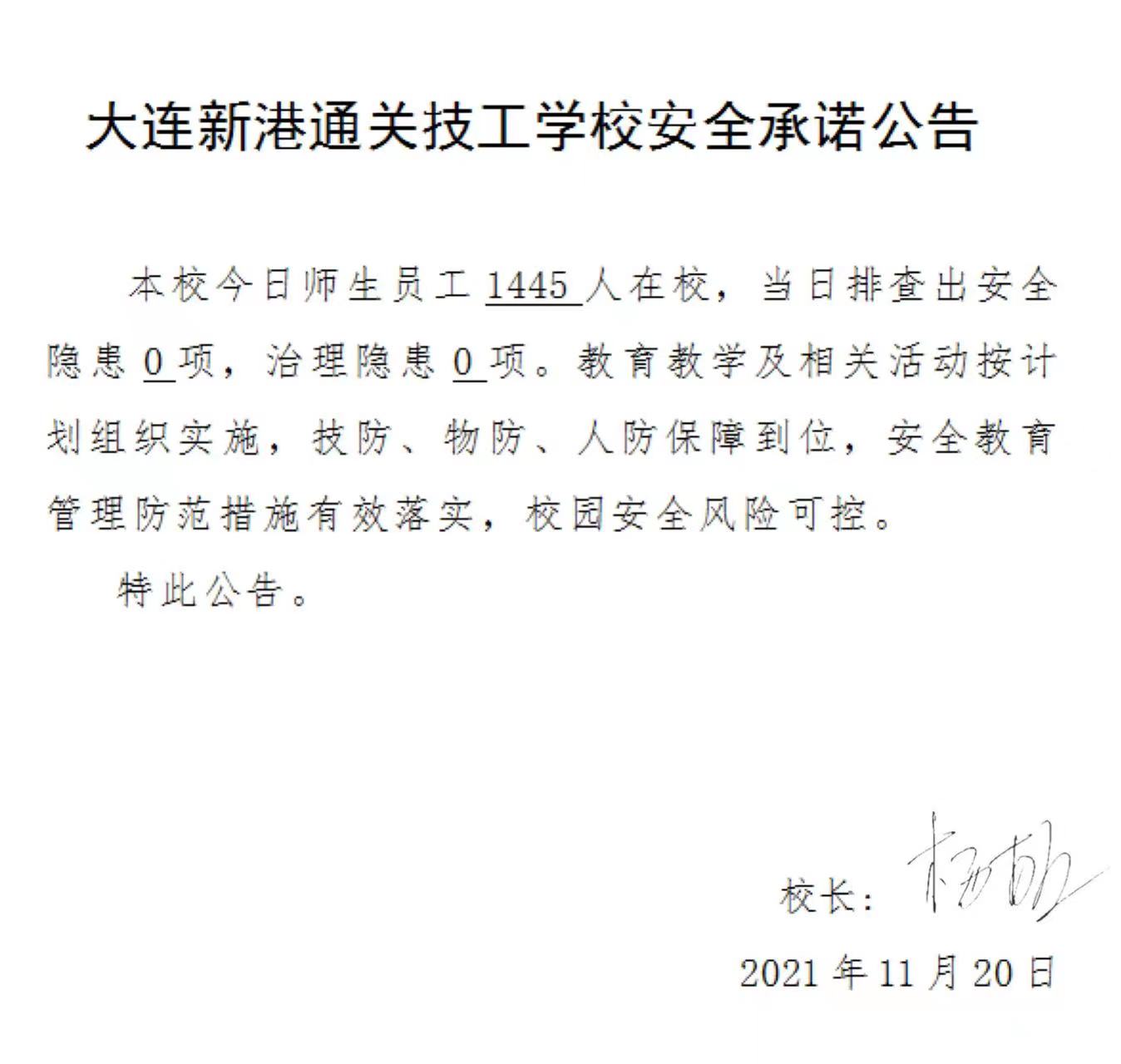 大连新港通关技工学校安全承诺公告(11月20日)