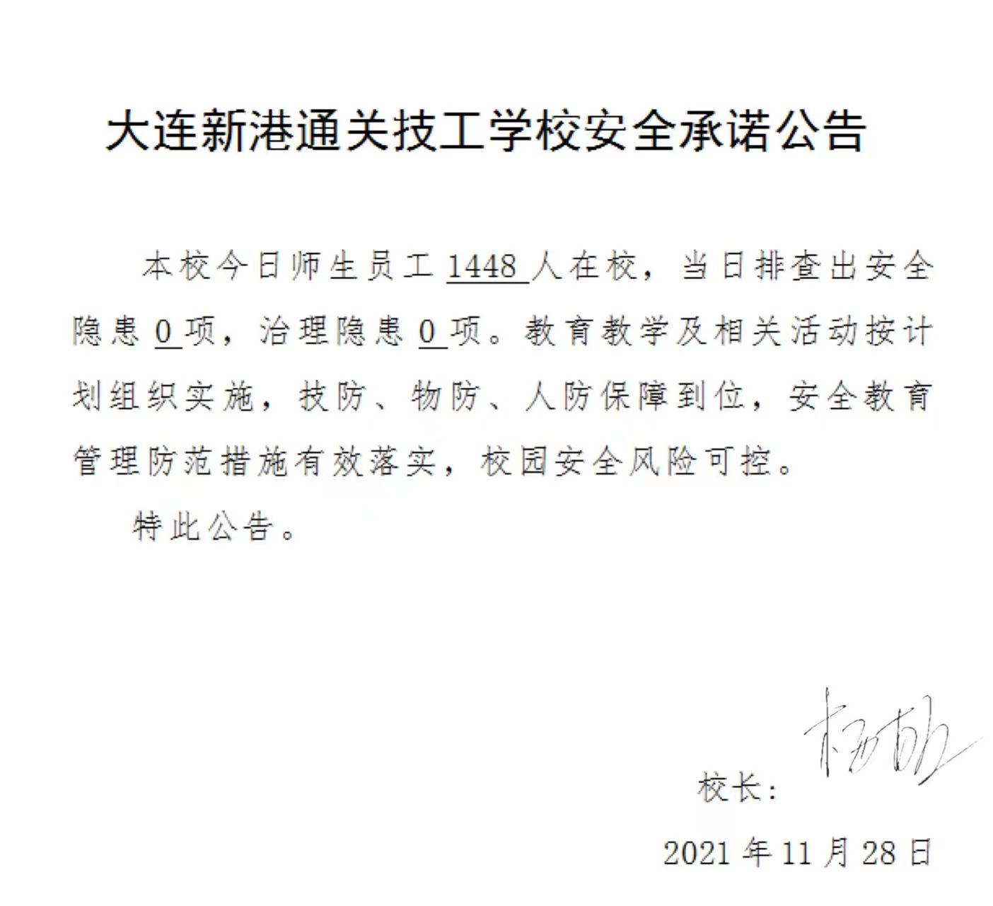 大连新港通关技工学校安全承诺公告(11月29日)