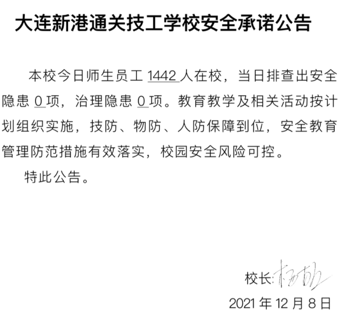 大连新港通关技工学校安全承诺公告(12月7日)