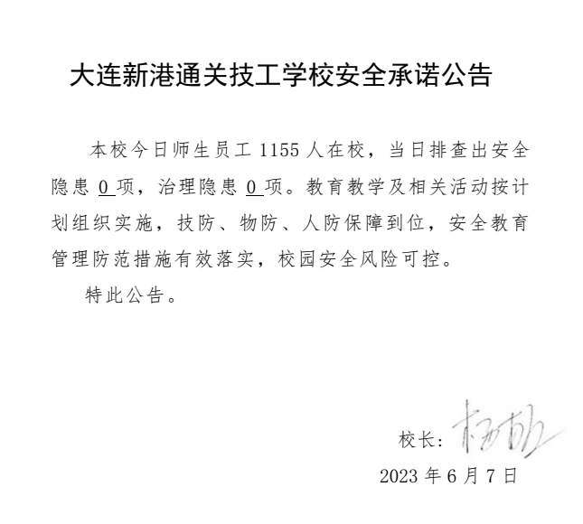 大连新港通关技工学校安全通告(2023年6月7日)
