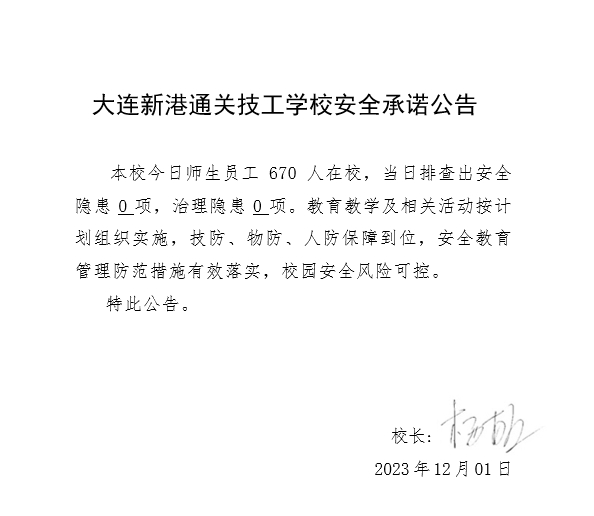 大连新港通关技工学校安全通告(2023年12月01日)