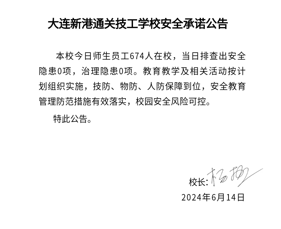 大连新港通关技工学校安全通告(2024年6月14日)