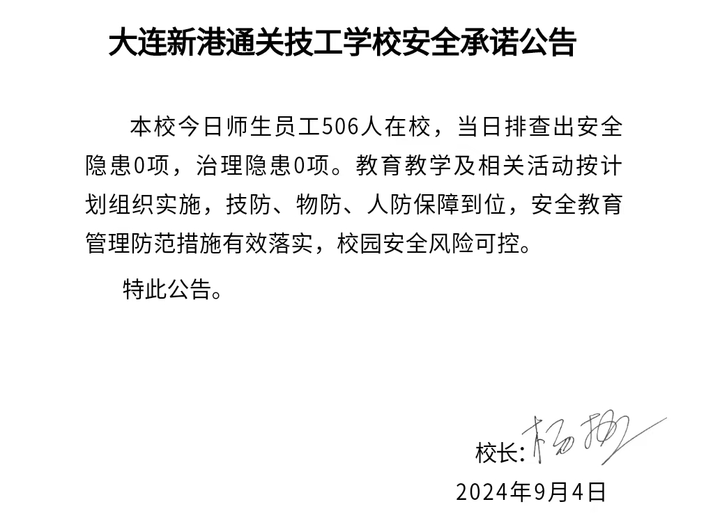 大连新港通关技工学校安全通告(2024年9月4日)