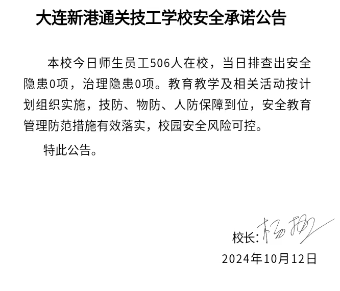 大连新港通关技工学校安全通告(2024年10月12日)