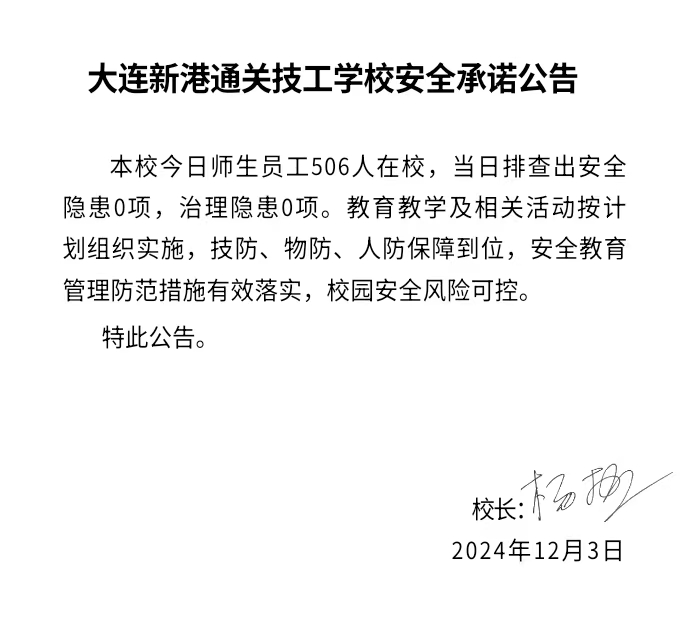 大连新港通关技工学校安全通告(2024年12月3日)