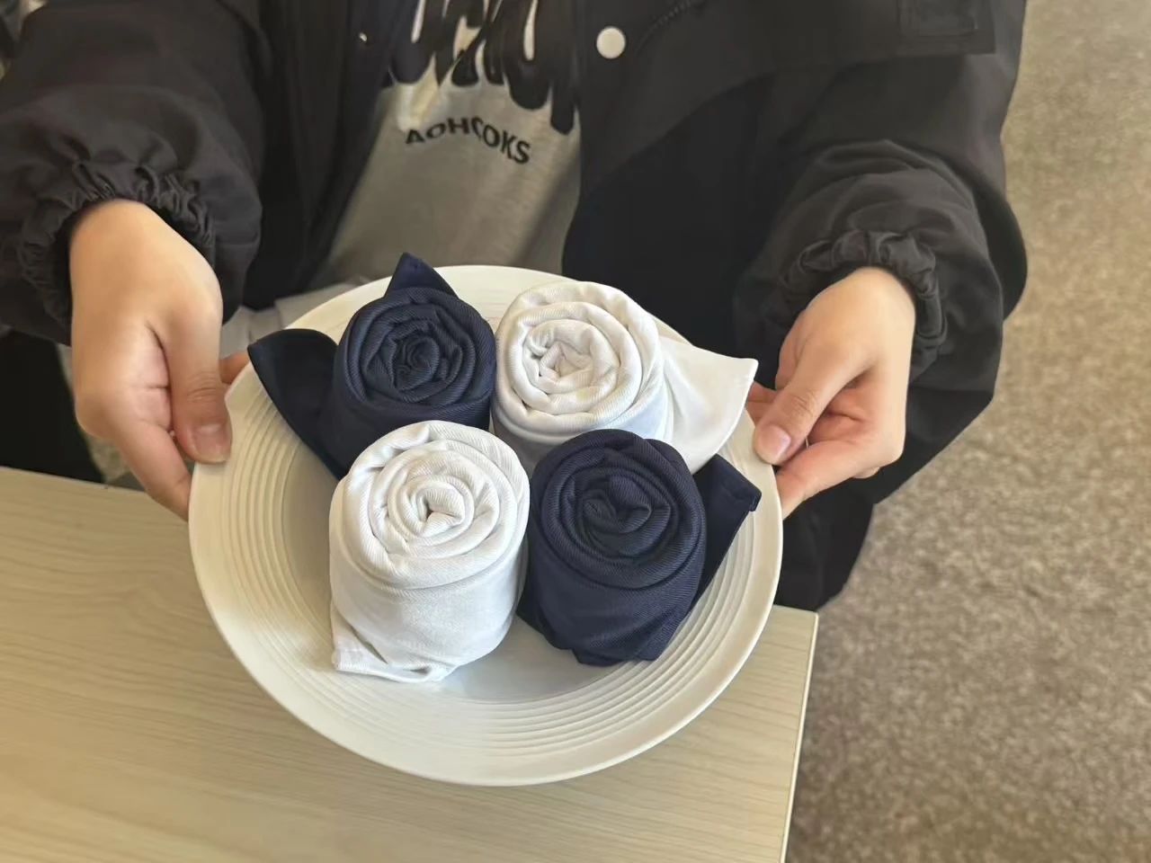 比赛开始前,同学们围坐在一起,认真思考着自己的桌花设计。他们手中的餐巾纸、缎带和丝线,在脑海中已然幻化成一件件精美的作品。有的同学以高铁为灵感,打算用叠花呈现出高铁飞驰的动感;有的同学则着眼于飞机,想通过桌花展现飞机翱翔天际的姿态 ,还有的同学钟情于轮船,计划用桌花描绘轮船在海洋中乘风破浪的模样。每个人都在为即将开始的比赛精心筹备,眼中闪烁着期待与兴奋的光芒。
