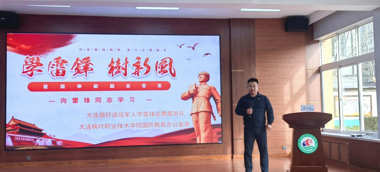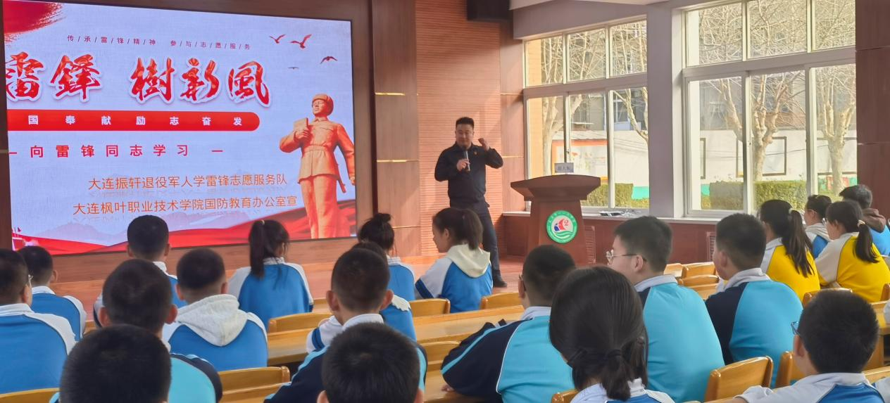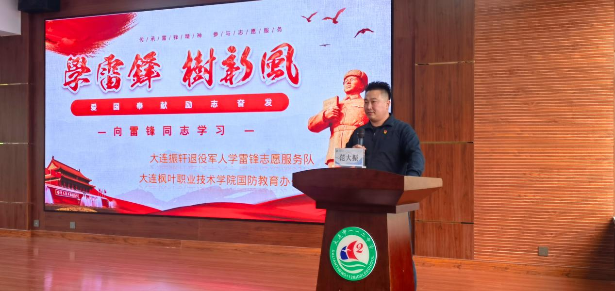 本次活动以“弘扬雷锋精神,担当强国使命”为主题,为师生们开展爱国主义教育授课。活动以庄严的升旗仪式作为开场,邀请了大连市最美退役军人、大连枫叶职业技术学院国防教育办公室主任、大连振轩退役军人学雷锋志愿服务队队长范大振出席并进行主题宣讲。