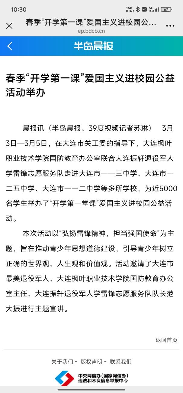 为持续深化雷锋精神的影响力和吸引力,提升青少年的社会责任感和爱国情感,聚焦于立德树人的根本任务,引领青少年成为肩负民族复兴大任的时代新人。3月3日—3月5日,在上级部门的指导下,大连枫叶职业技术学院国防教育与中职校联合党支部联合大连振轩退役军人学雷锋志愿服务队,为大连市一一三中学、大连市一二五中学及大连市一一二中学等多所学校,逾5000名学生,举办了“开学第一堂课”爱国主义进校园公益活动。